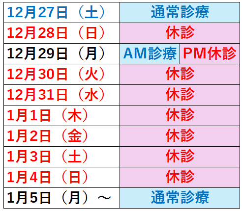 年末年始の診療予定は下記の通りとなります。